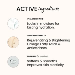 Organic Cloudberry Seed Oil. Squalane (from Olives) and Hyaluronic Acid improve tone. texture. elasticity and radiance with tried and true Antioxidants. including Vitamin A. E. C. B5 and Omega Fatty Acids for a noticeably youthful and rejuvenated appearance.